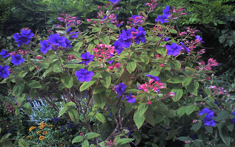 In general the Glory Bush is a tropical evergreen tree or shrub, with large hairy leaves, deeply veined, and showy purple flowers.