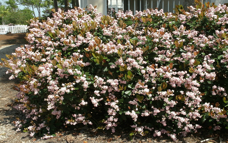 This small evergreen shrub grows slowly to about 2-1/2 feet tall by 3 feet wide. It's cold hardy, salt-tolerant, and moderately drought-tolerant once established. In cooler months, you'll notice an occasional bright red or orange leaf. Spring flowers are brief but very showy.
